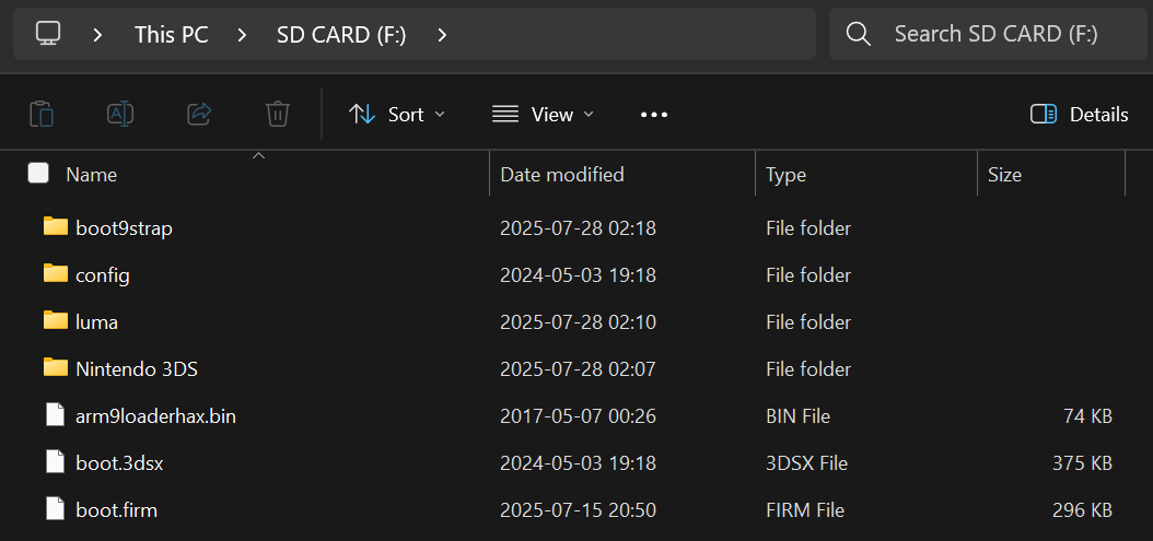 .zipto the root of your SD card- The root of the SD card refers to the initial directory on your SD card where you can see the Nintendo 3DS folder, but are not inside of it