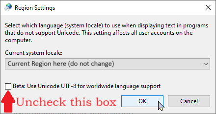 Beta: Use Unicode UTF-8 for worldwide language supportthen click "OK"INFO